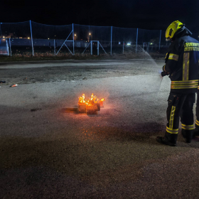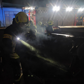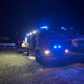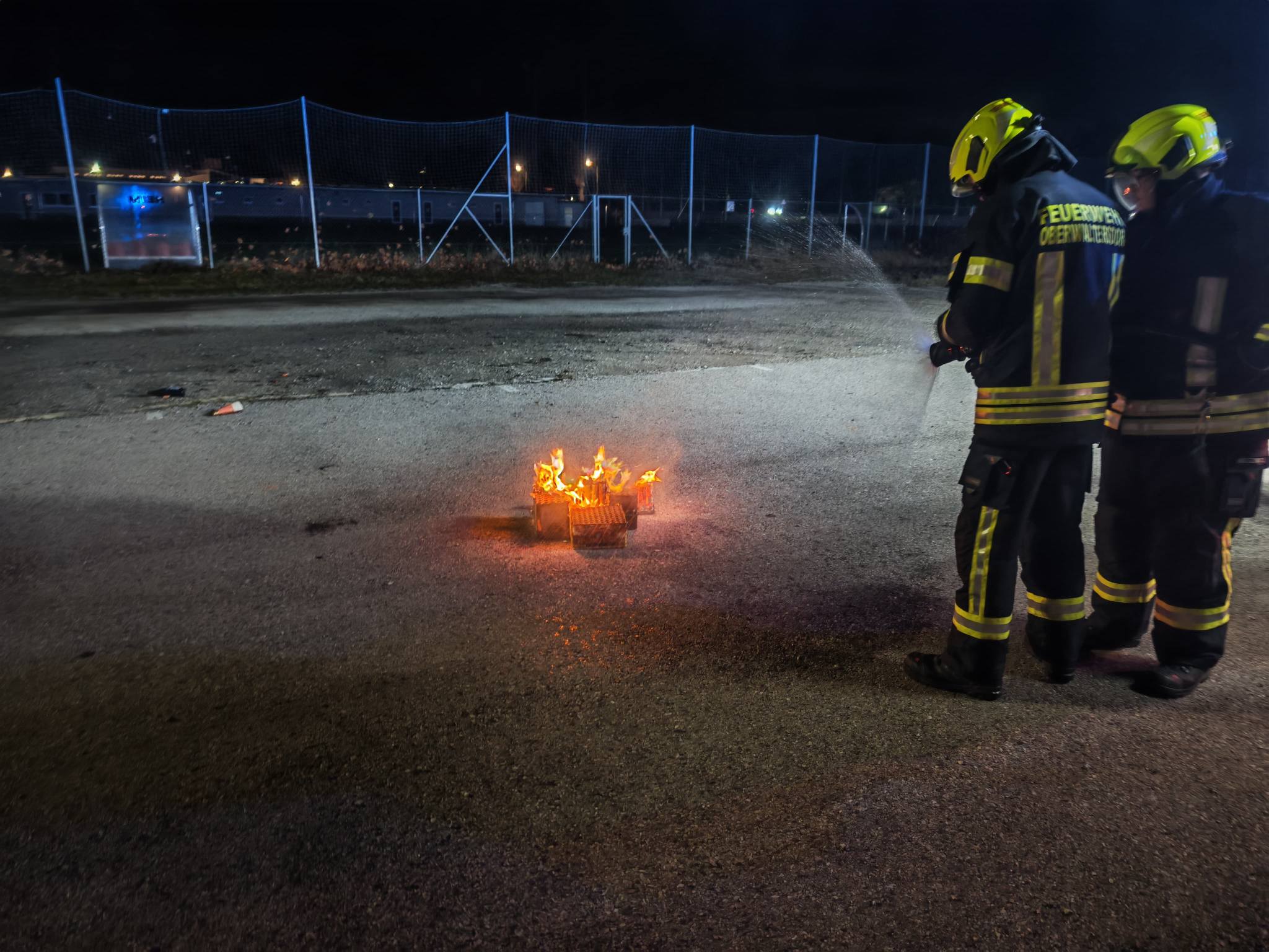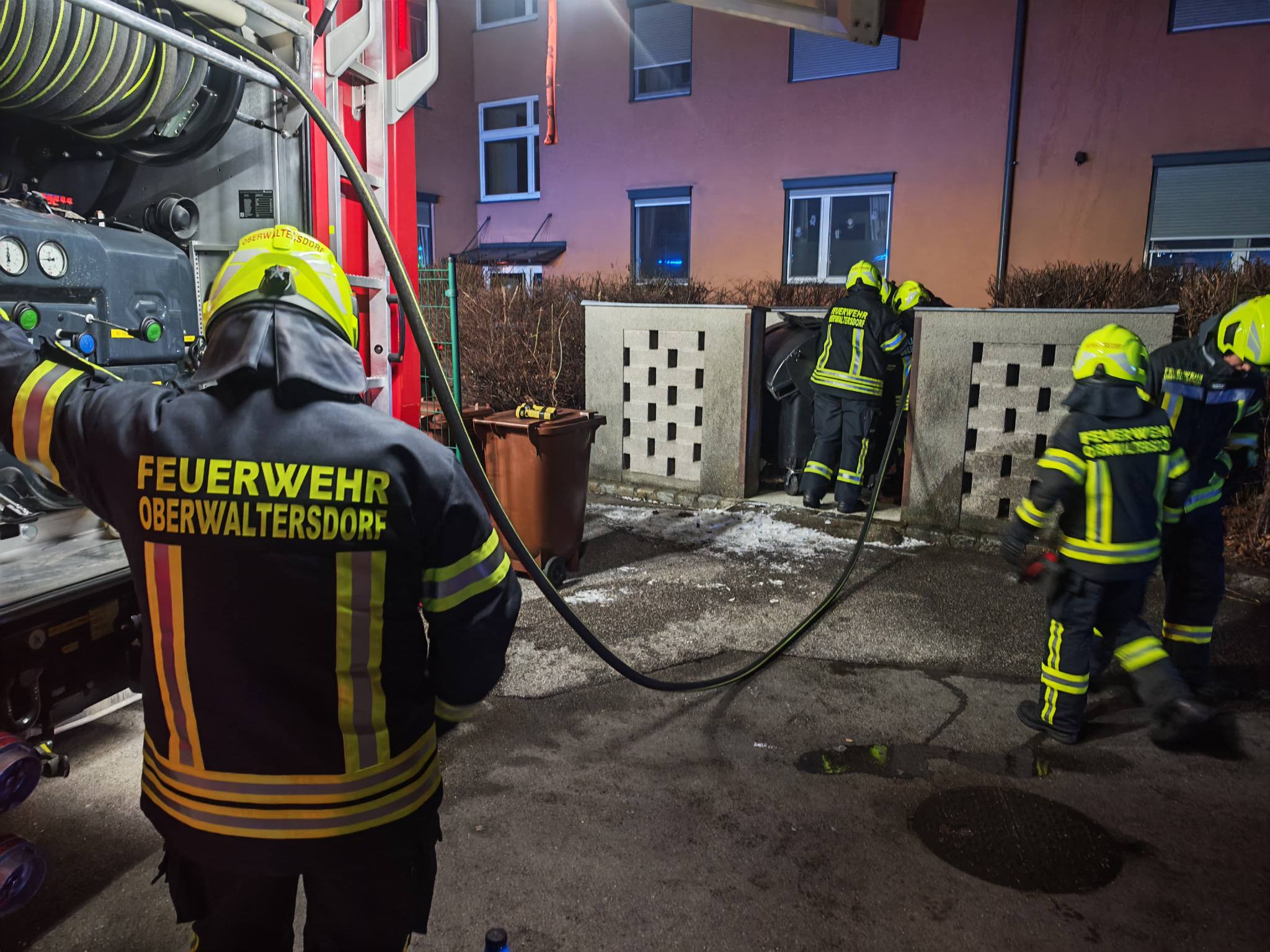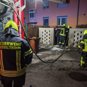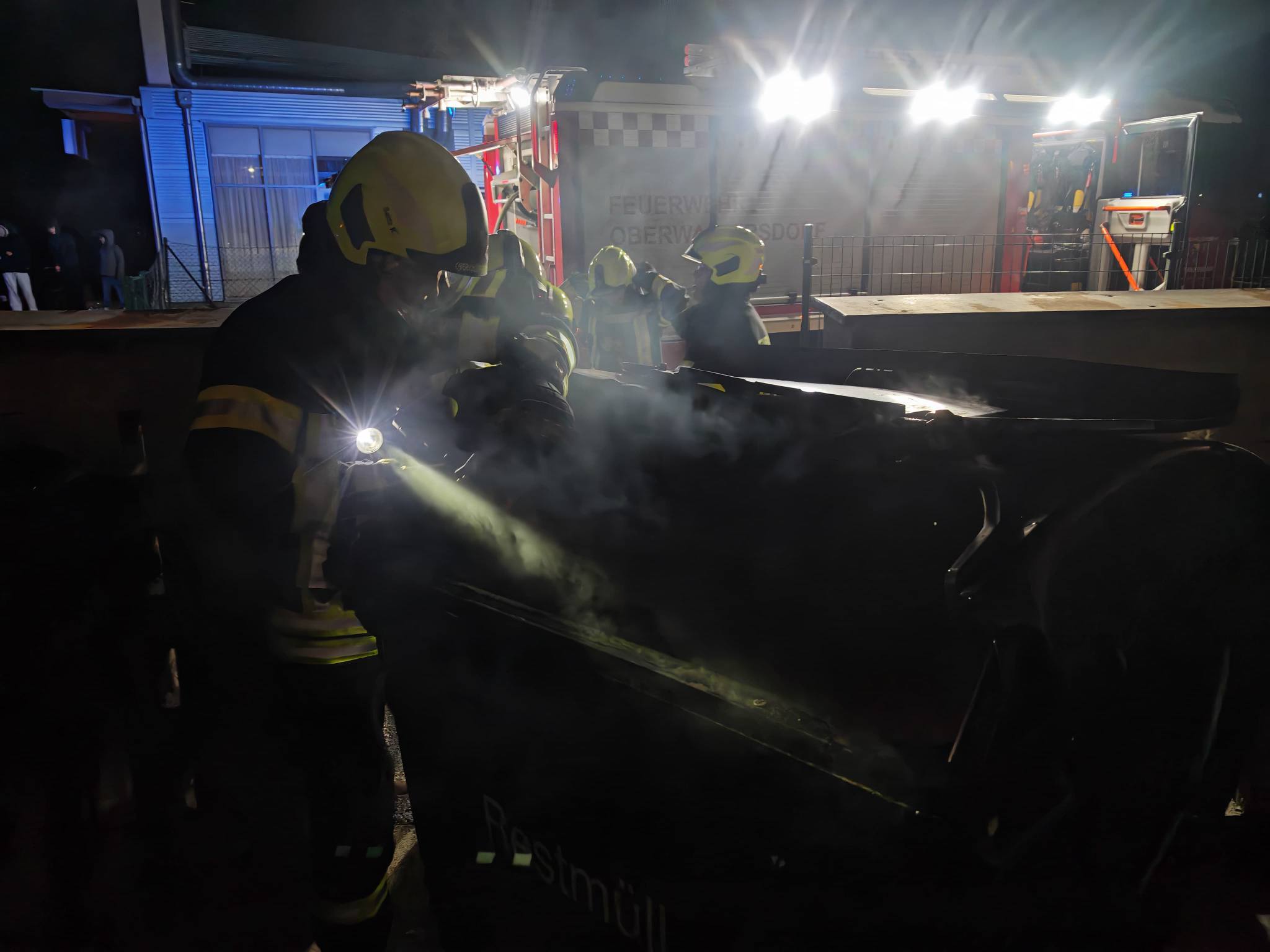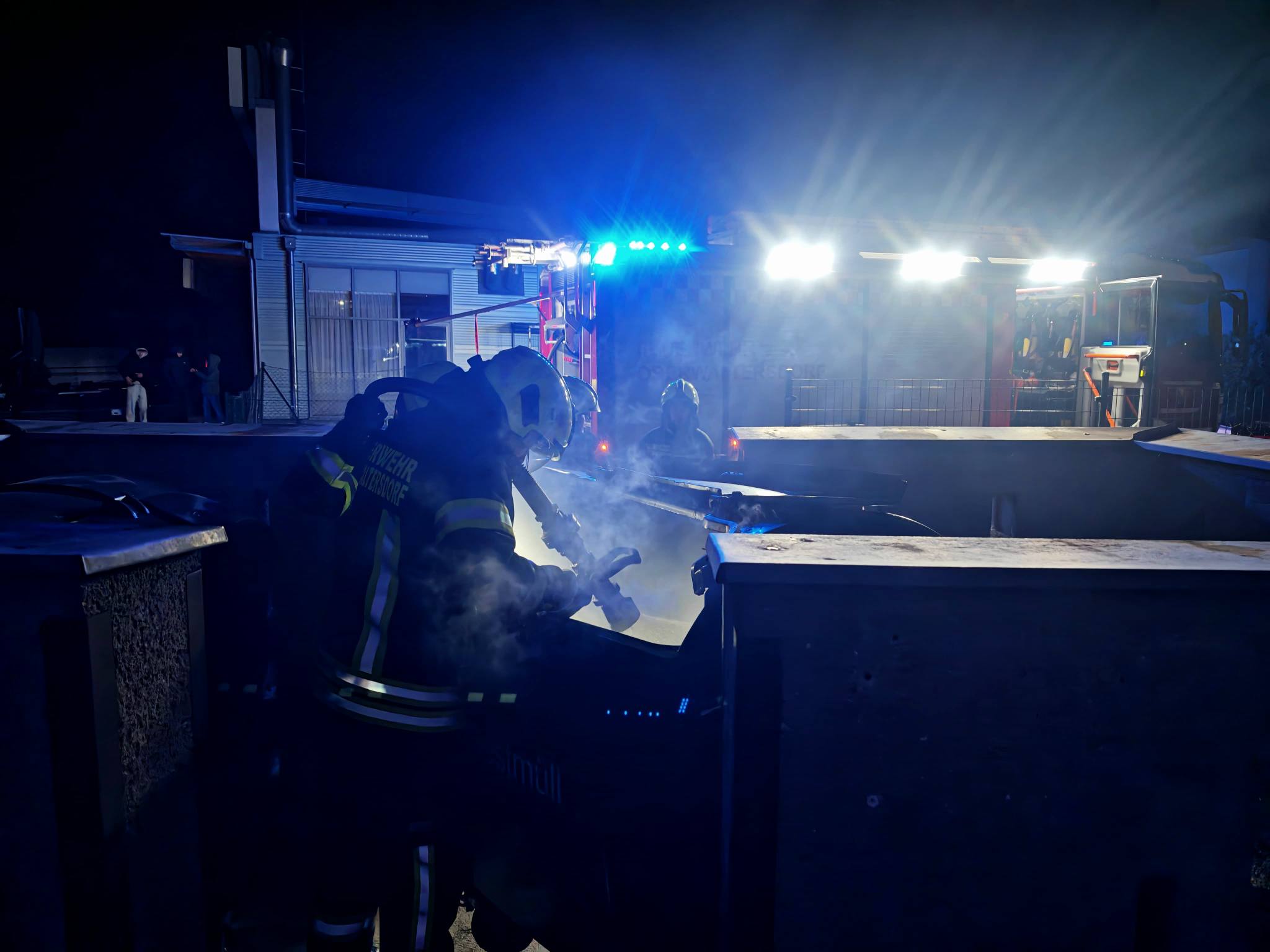 Die beiden ausgerückten Löschfahrzeuge, das HLFA3/4000 sowie das TLFA2000, mussten einen in Brand geratenen Großraummüllcontainer im Bereich einer Müllinsel und eine brennende Feuerwerksbatterie auf einem Parkplatz löschen.